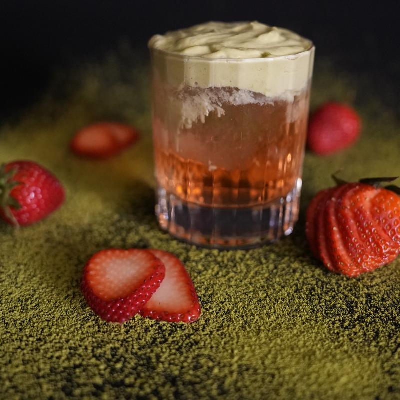 White Rum, Strawberry Lemon Rosemary Oleo, Strawberry Matcha Milk Foam, Milk Clarified
